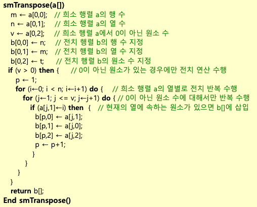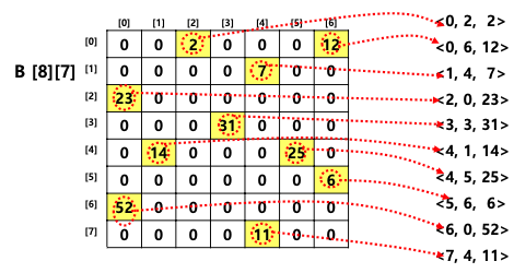 • 희소 행렬인 경우에는 0이 아닌 원소만 추출하여 <행번호, 열번호, 원소>쌍으로 배열에 저장