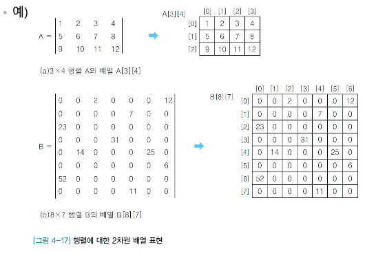 • [그림 4-17]의 희소 행렬 B는 배열의 원소 56개 중에서 실제 사용하는 것은 0이 아닌 원소를 저장하는 10개 뿐이므로 46개의메모리 공간 낭비