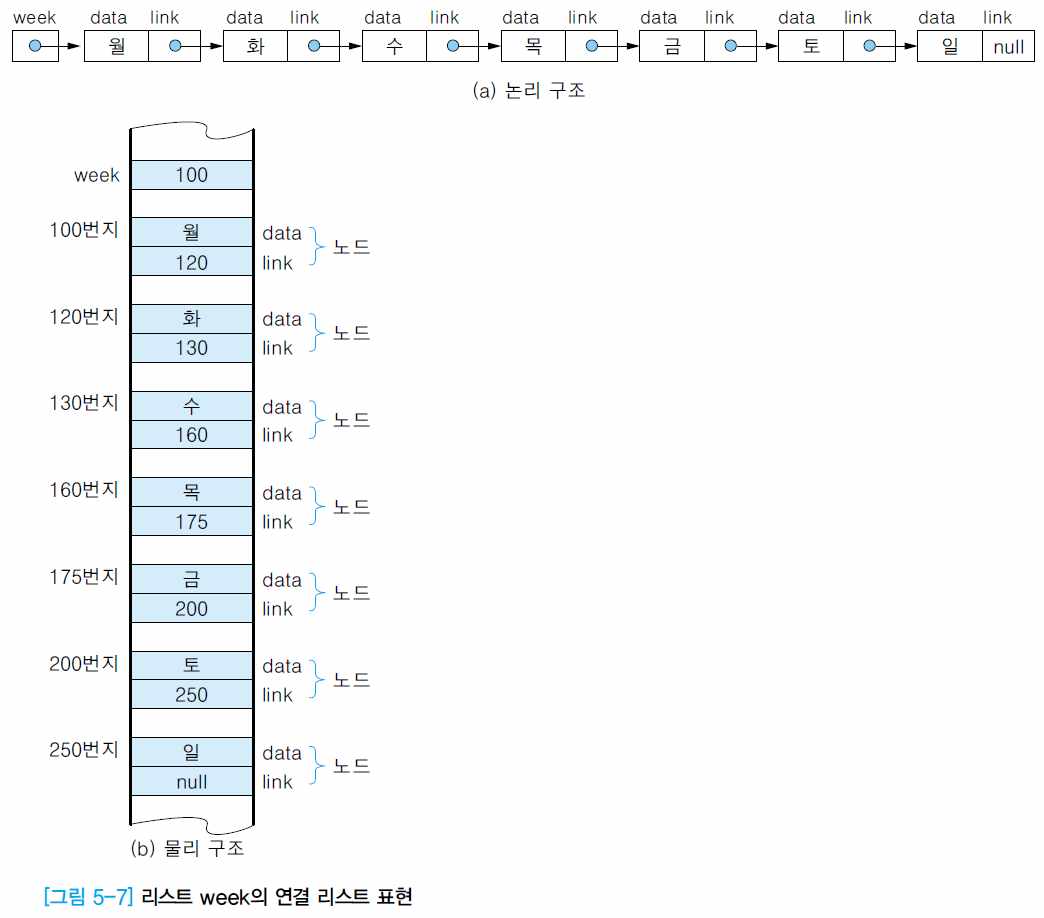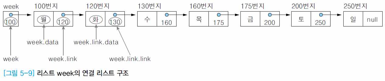 − week.link : 포인터 week가 가리키는 노드의 링크 필드에 저장된 주소값 “120”