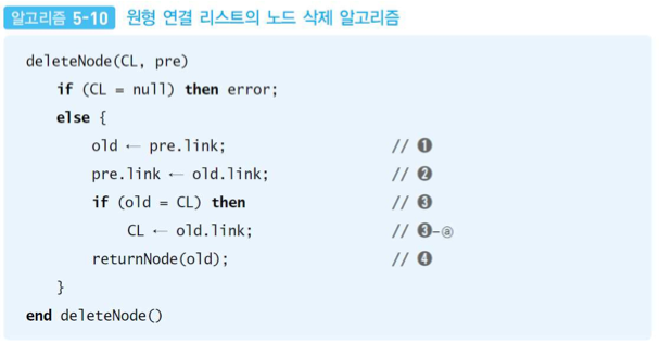 원형 연결 리스트 CL에서 포인터 pre가 가리키는 노드의 다음 노드를 삭제하고 삭제한 노드는 자유공간 리스트에 반환하는 연산