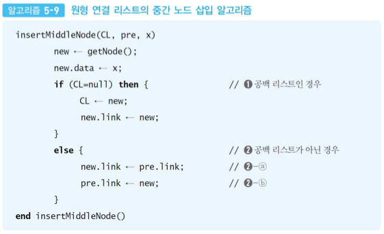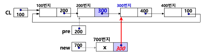 • 원형 연결 리스트 CL에 x 값을 갖는 노드 new를 포인터 pre가 가리키는 노드의 다음 노드로 삽입하는 알고리즘