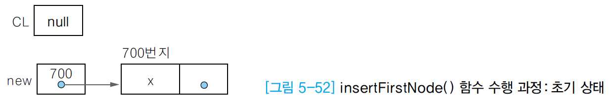 • 노드 new의 값을 리스트 포인터CL에 저장하여 노드 new가 리스트의 첫 번째 노드가 되도록 지정