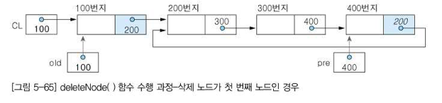 • 첫 번째 노드를 삭제하는 경우에는 노드 old의 링크 값을 리스트 포인터 CL에 저장하여 두 번째 노드가 리스트의 첫 번째 노드가 되도록 조정