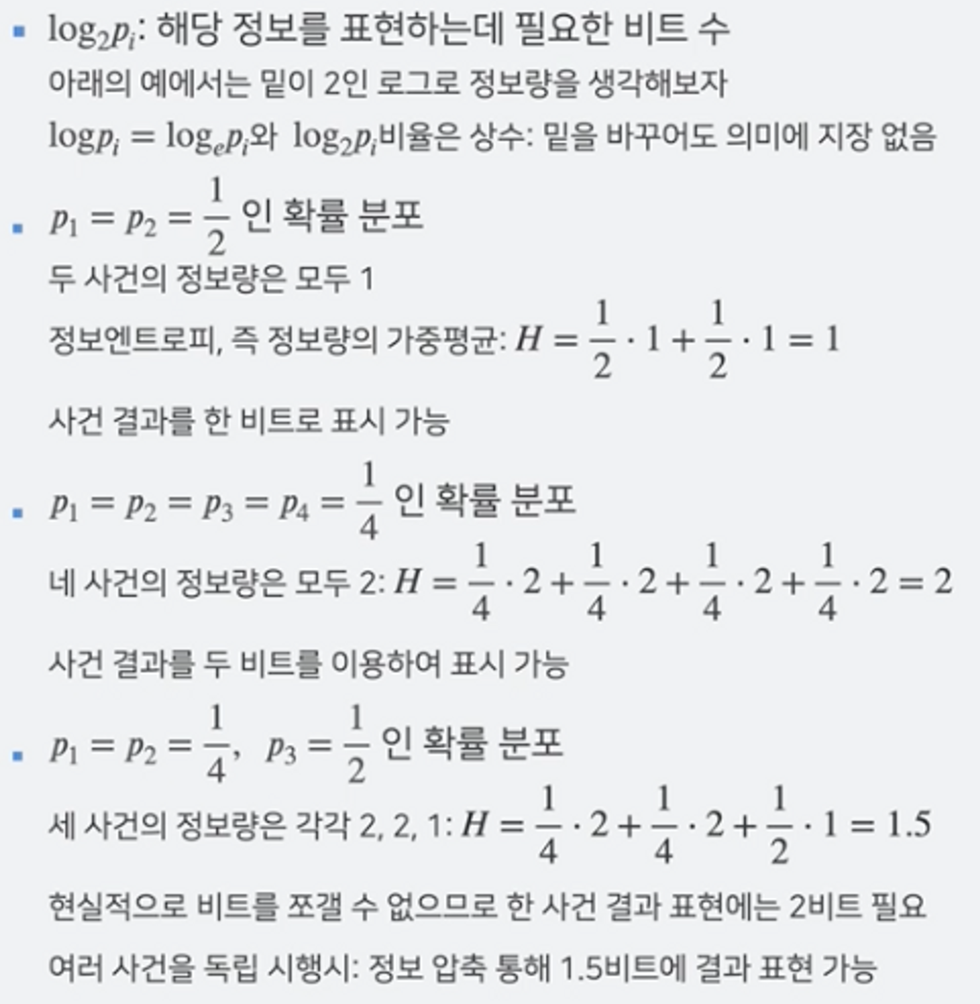 - 정보 엔트로피 = 정보량의 가중평균