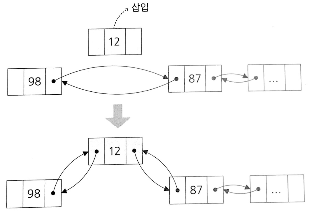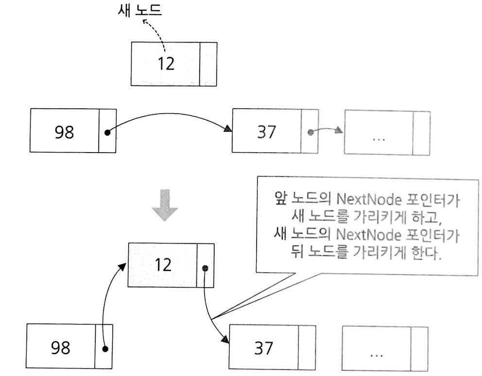 - 노드 삽입: 노드사이 새 노드를 끼워 넣을때 앞 노드의 포인터가 새 노드를 가리키게 하고 새 노드의 포인터가 뒤 노드를 가리키게함.