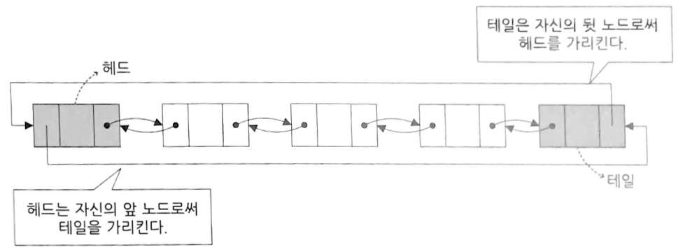 : 헤드와 테일이 연결되어있음. 즉 헤드의 앞 노드로 테일을, 테일의 뒷 노드로 헤드를 가리킴.