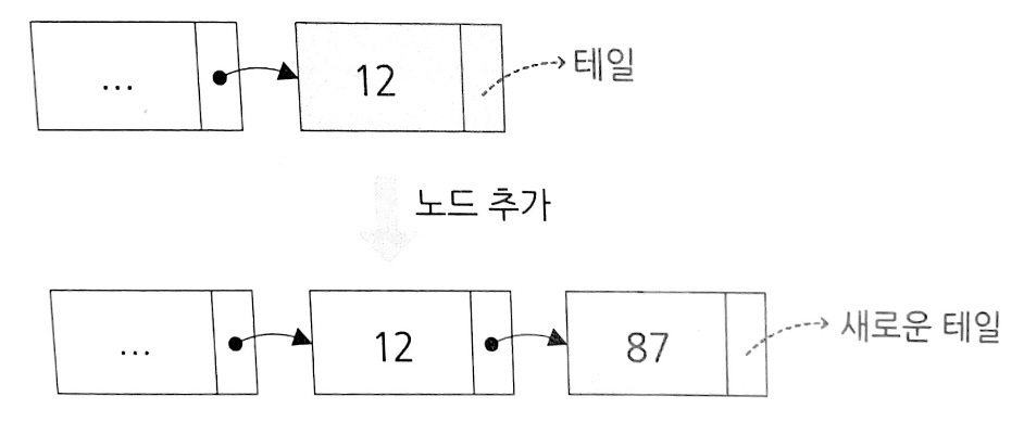 - 노드 추가: 기존 테일의 포인터가 새로추가된 테일을 가리킴.
