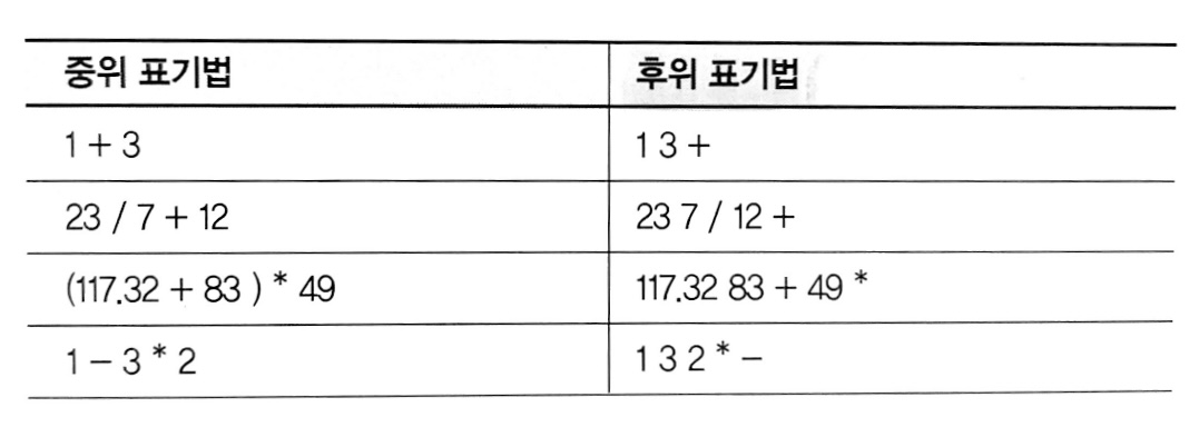 중위 표기법(Infix Notation): 우리가 일상적으로 사용하는 수식 표기법 ex) 23 / 7 + 12