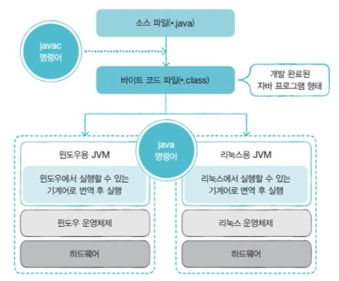 바이트 코드 파일을 운영체제에서 실행하기 위해서는 JVM이라는 번역기를 통해 해당 운영체제에서 실행 가능한 기계어로 번역해 실행한다. 즉 운영체제와 상관없이 자바 프로그램 개발이 가능하다.