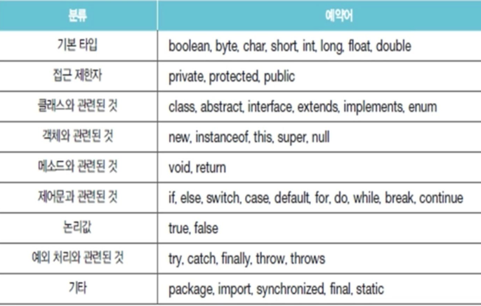 예약어: 자바 언어에서 의미를 가지고 사용되는 단어로 변수 이름으로 사용시 에러 발생