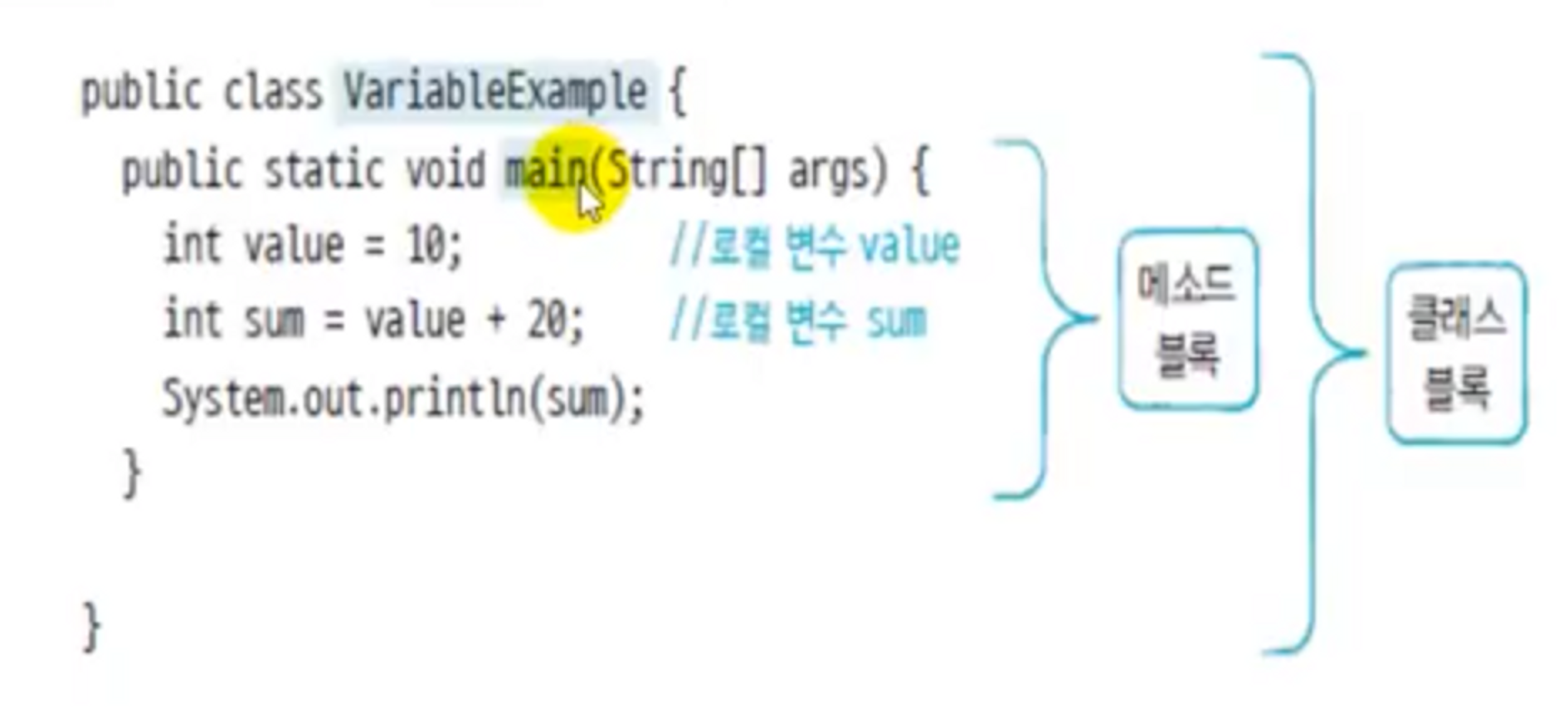 메소드 블록 내에는 다른 중괄호 {}블록들이 작성될 수 있음. ex)if() {}, for() {}, while() {}등