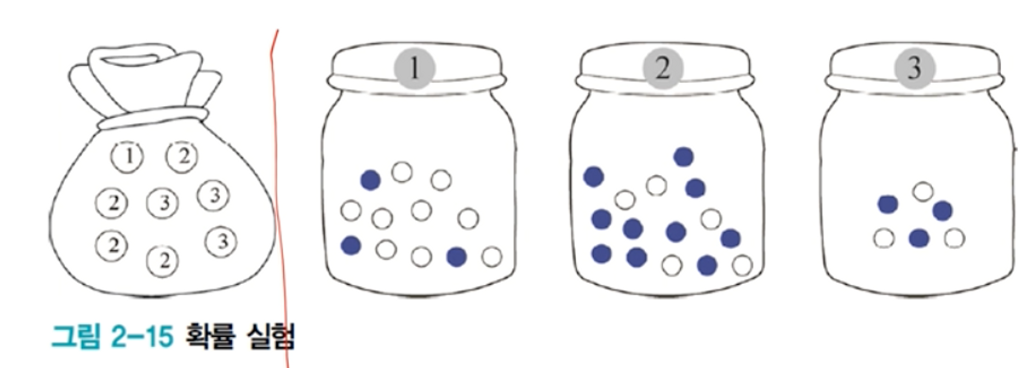 주머니에서 번호를 뽑은 다음, 번호에 따라 해당 병에서 공을 뽑고 색을 관찰