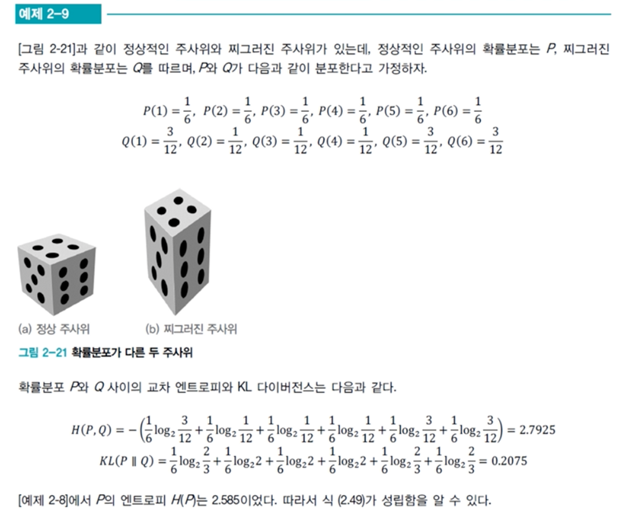 H(P)=2.585 와 KL(P||Q)=0.2075를 더하면 H(P,Q)=2.7925가 나오는 상관관계가 있다.