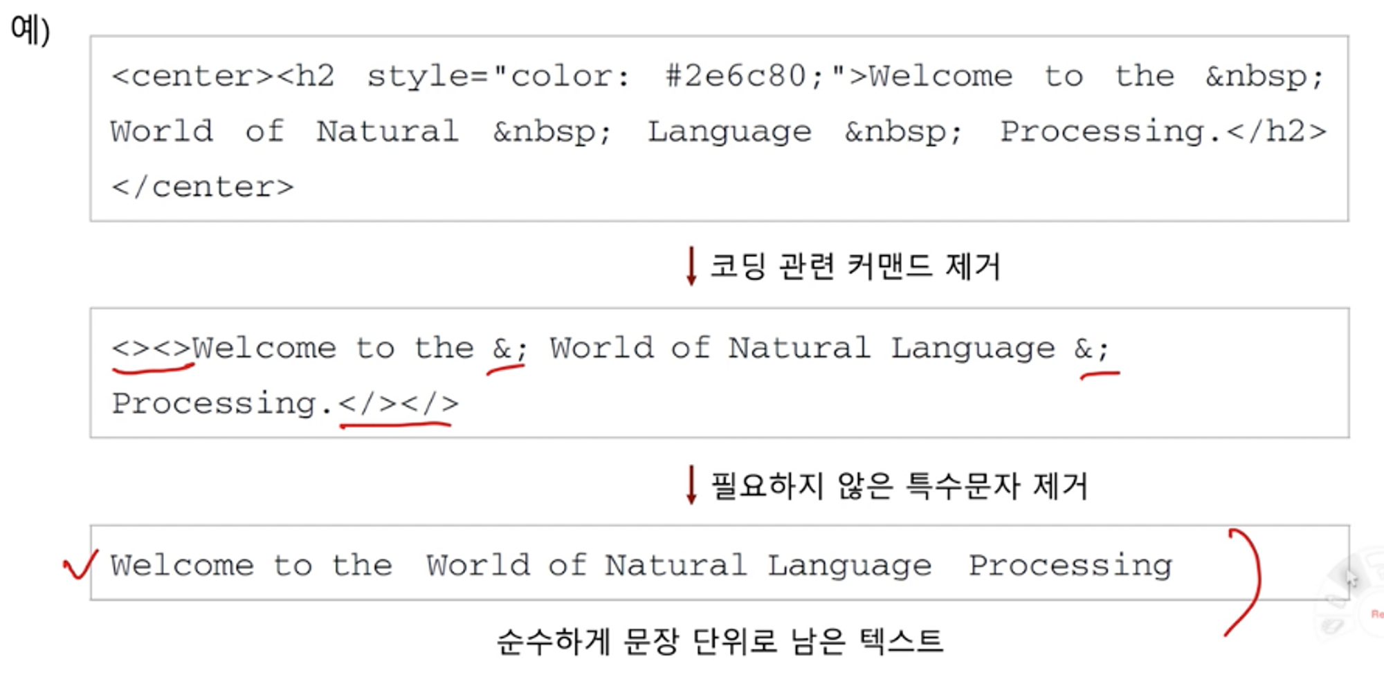 -특수문자 제거, 관련 없는 특수 커맨드 or 코딩을 규칙적으로 제거, PDF는 텍스트를 문장 단위로만 끊어 줄 바꿈 무시. ⇒ 문장의 경계 인식해야함.