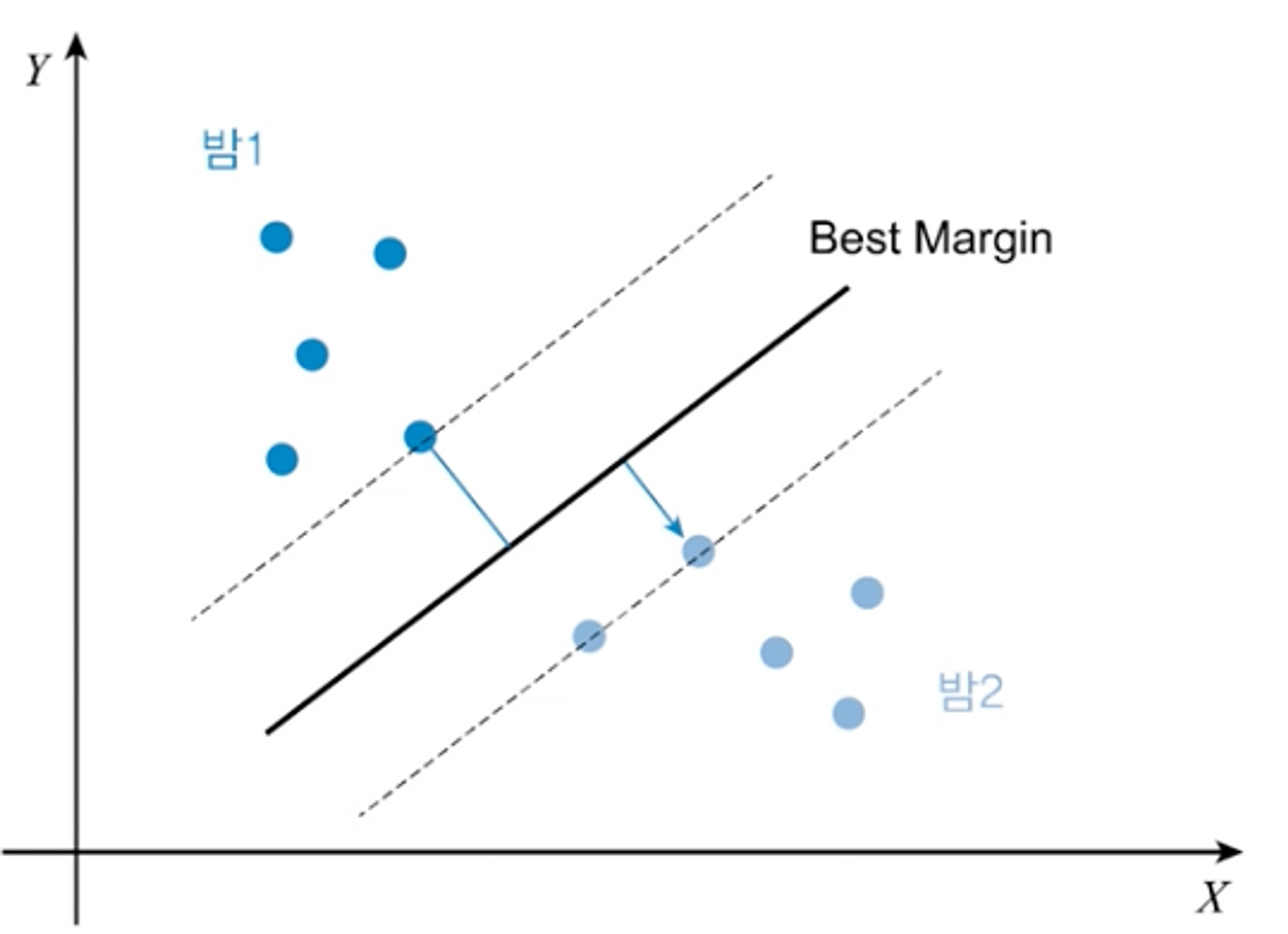 벡터 공간에 표현된 자질로부터 의미 클래스를 분류하기위해 의미 클래스 간에 가장 넓은 거리를 사용하는 방향으로 선을 그어 의미를 분류