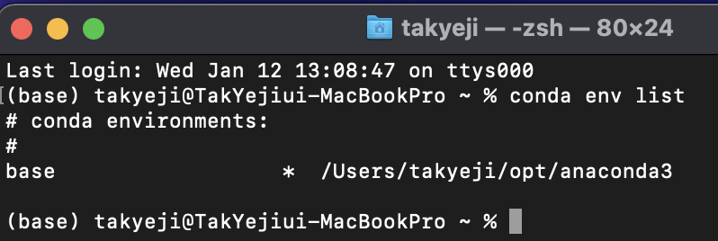 설치가 완료되면 처음 입력했던 가상환경 목록 확인 명령어를 다시 입력하여 패키지가 생성된 것을 확인합니다.