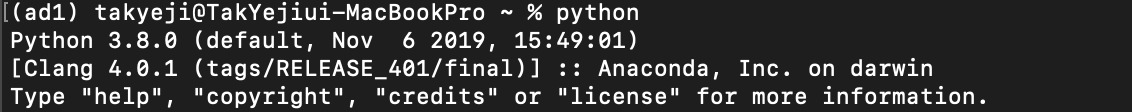 ad1 가상환경이 생성되었지만 아직 활성화되지 않아 base에 *표시가 있습니다.