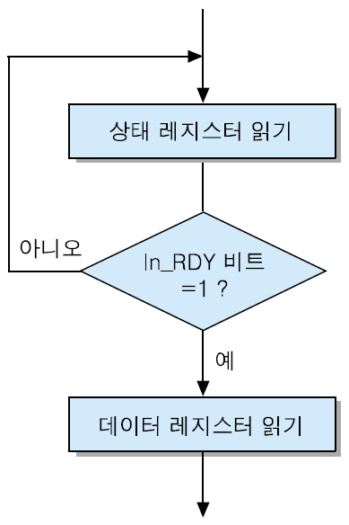 2 만약 세트 되지 않았으면, 1번을 반복하며 대기. 만약 세트 되었다면, 데이터 레지스터 의 내용을 읽음