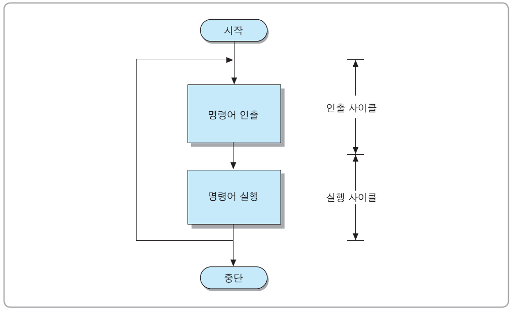 ▪ CPU가 프로그램 실행을 시작한 순간부터 전원을 끄거나 회복 불 가능한 오류가 발생하여 중단될 때까지 반복