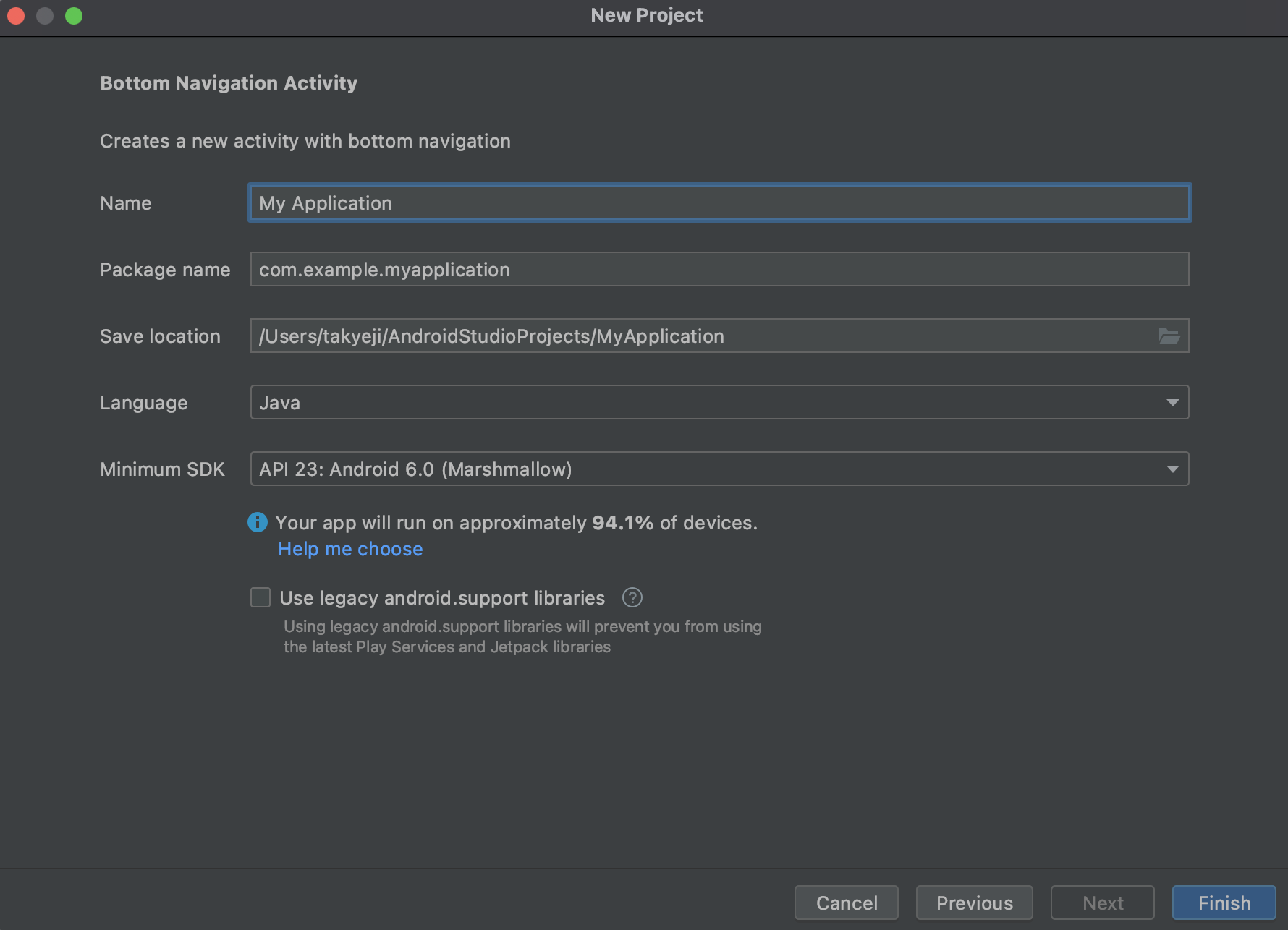 프로젝트 이름, 패키지 이름, 저장경로, 사용 언어, 최소 SDK 버전을 설정할 수 있습니다.