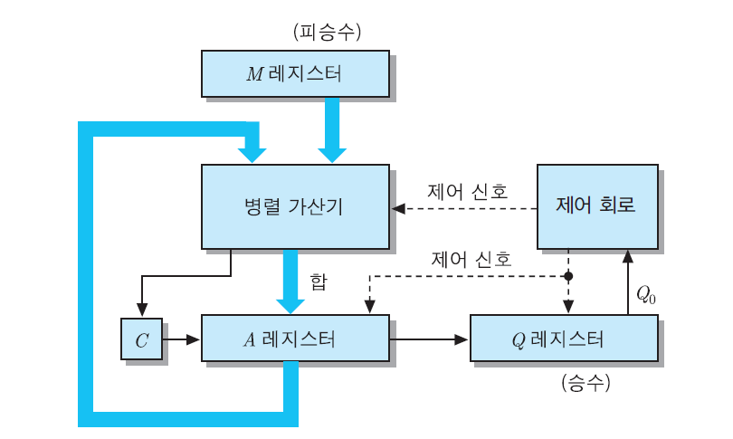 결과값은 A 레지스터와 Q 레지스터에 저장