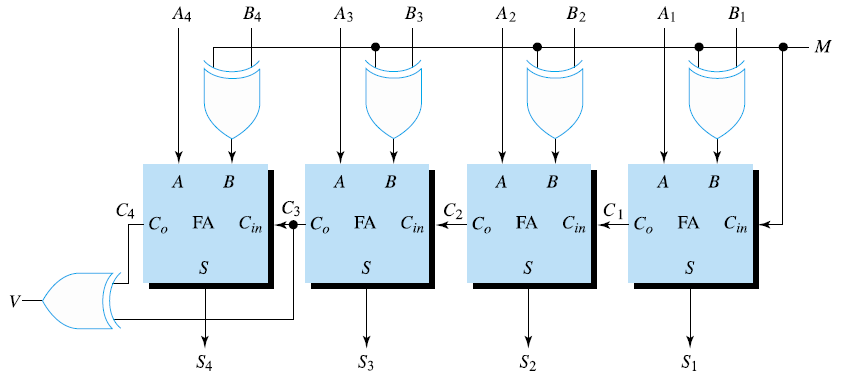 ▪ 제어신호 M = 0 : 덧셈, M = 1 : 뺄셈(입력 B의 비트들을 반전하고, 최 하위 올림수로서 M 을 입력)