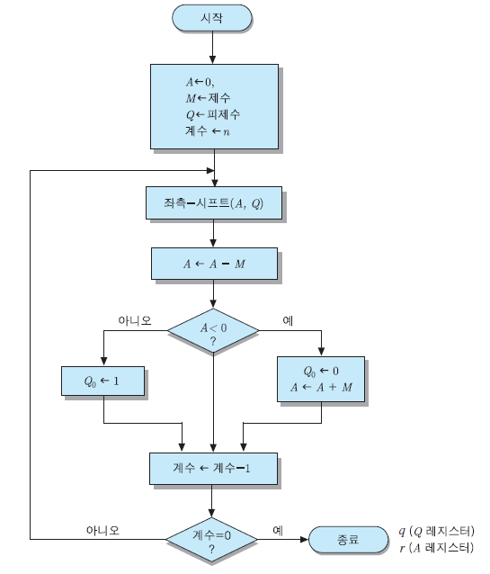 부호 없는 2진 나눗셈 알고리즘의 흐름도