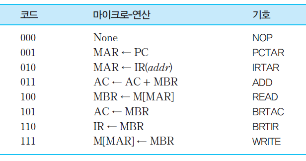마이크로연산들에 대한 2진 코드 및 기호 [예]