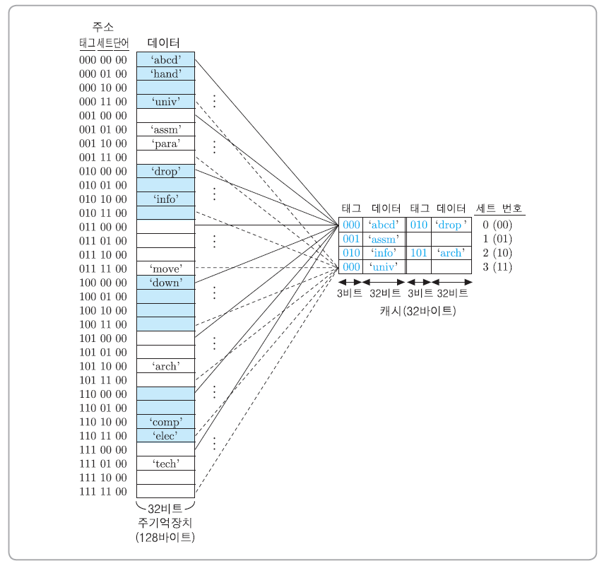 ▪주기억장치 블록 그룹이 하나의 캐시 세트를 공유하며, 그 세트에는 두 개 이상의 라인들이 적재될 수 있음