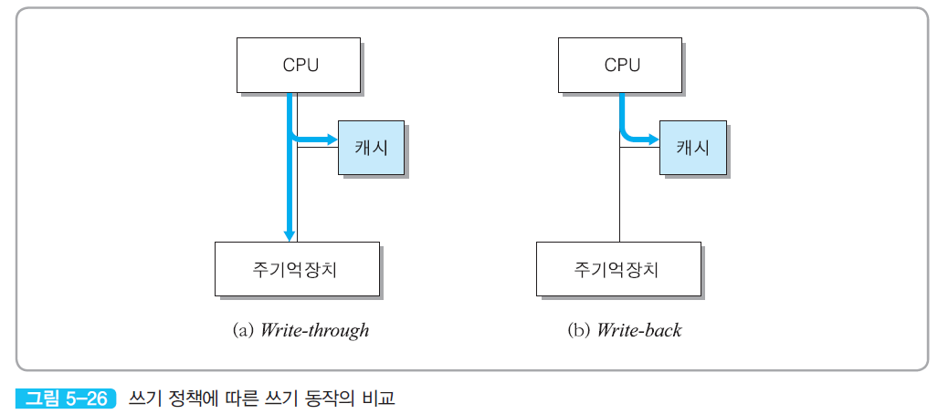 1. Write-through : 모든 쓰기 동작들이 캐시로 뿐만 아니라 주기억장 치로도 동시에 수행되는 방식