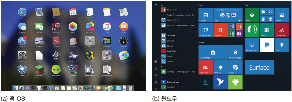 • GUI(Graphic User Interface): 아이콘이나 그림과 같은 그래픽 요소를 배치하고, 마우스 등의 포인팅 장치를 이용해 조작한다.