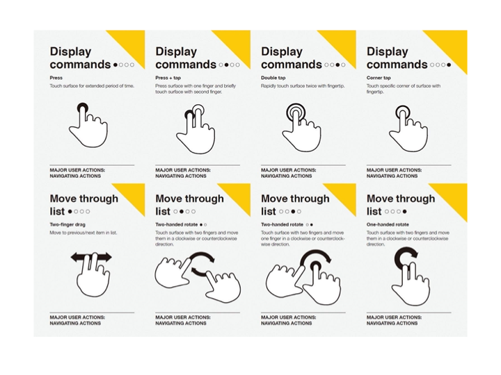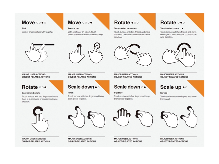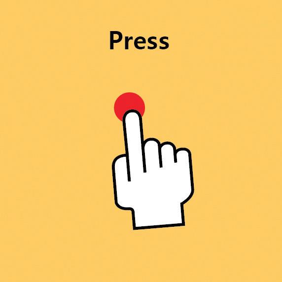 • 프레스(Press) : 화면을 2초 이상 손가락으로 길게 누르는 동작. 터치 앤드 홀드. 메 뉴나 팝업과 같은 화면의 컴포넌트를 나타나게 하거나 글씨를 확대 또는 복사하는 용도