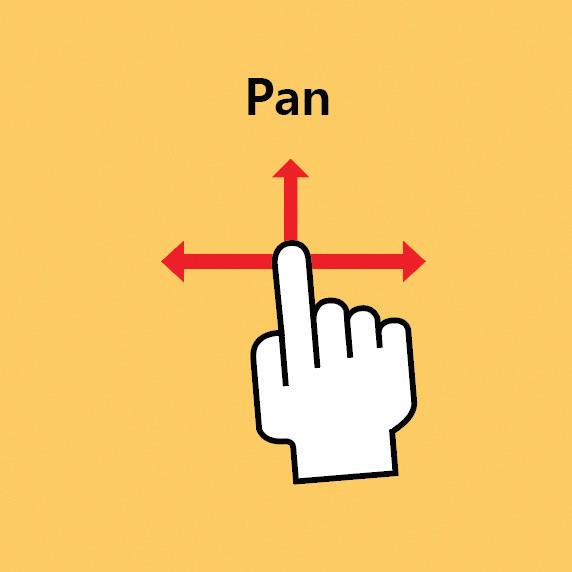 • 팬(Pan):손가락을떼지않고길게끄는동작,어느방향으로든움직일수있음.화 면의 오브젝트를 이동할 때, 선을 그릴 때, 다중 개체를 선택할 때, 확대한 이미지 화면을 상하좌우로 움직일 때 사용