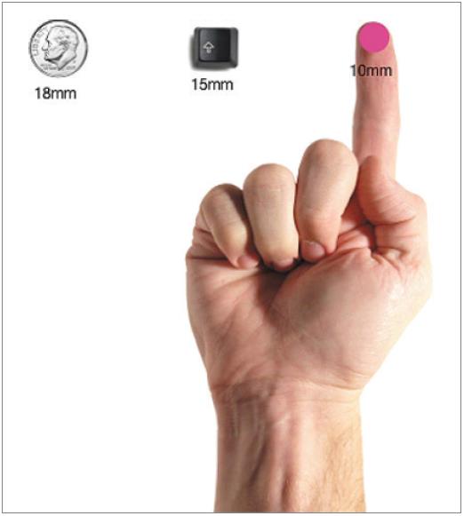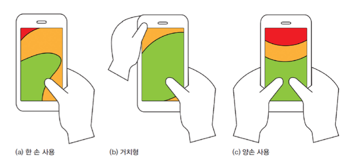 • 터치를 위해 필요한 공간은 10~14mm 정도인데, 이는 아이폰 기준으로 88pixels 정도이다. 손가락의 지문 영역을 고려할 때, 그 크기가 최소7 mm 또는 44pixels이 되어야 엄지로 터치할 수 있다.